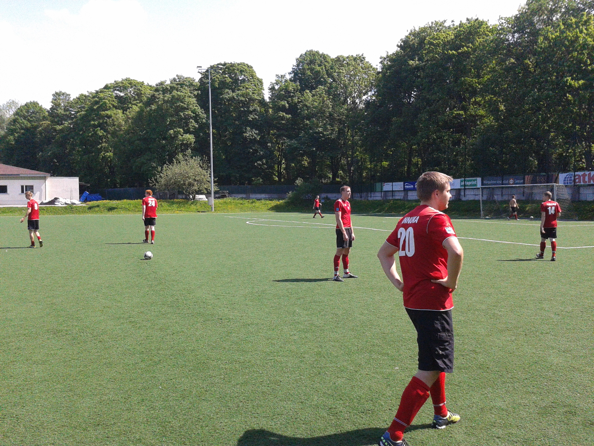 Kuigi Viimsi kontrollis mängu, siis juhtima asusime hoopis meie vasturünnakust. Mareku hea püstsööt leidis Kareli, kes üks ühele olukorrast tõstis palli kenasti Olav Arge selja taha. Viimsi kombineeris ja otsis auke meie kaitsete selja taha. Umbes 23. minutil anti hea pall äärele, kust Viimsi mängija suutis äärelt läbi mängida ning üpris terava nurga alt sooritas ka lähilöögi, kuid meie õnneks suutis Gerd palli nurgalöögiks tõrjuda. Mõni hetk hiljem sooritas Viimsi mängija umbes 23 meetrilt kauglöögi, mille Gerd nurgast ilusa hüppega minema tõrjus. Poolaja lõpu poole saime meiegi kena seinasöödu tulemusel kaugelt löögile - Mareku löögi suutis Arge lati alt ära tõrjuda. Poolajale läksime magusas 1:0 eduseisus.