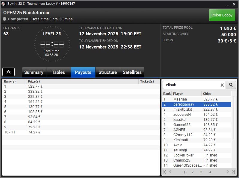 12. novembril toimunud 2025. aasta online-pokkeri Eesti meistrivõistluste naisteturniiril tuli meistriks Maarja Metshein.