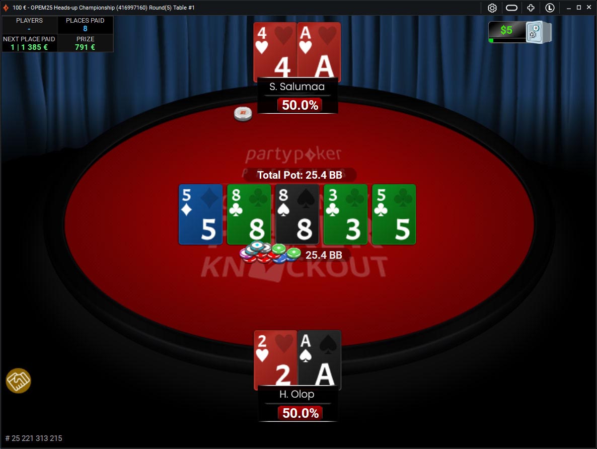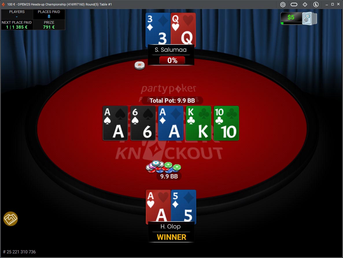 Flopis avanenud äss andis Salumaale suure edumaa, samas turni lisanduv viis andis Olopile mõningaid lisavõimalusi, kuid riverisse loositud tühi neli ei muutnud enam midagi ja Salumaa võitis turniiri.