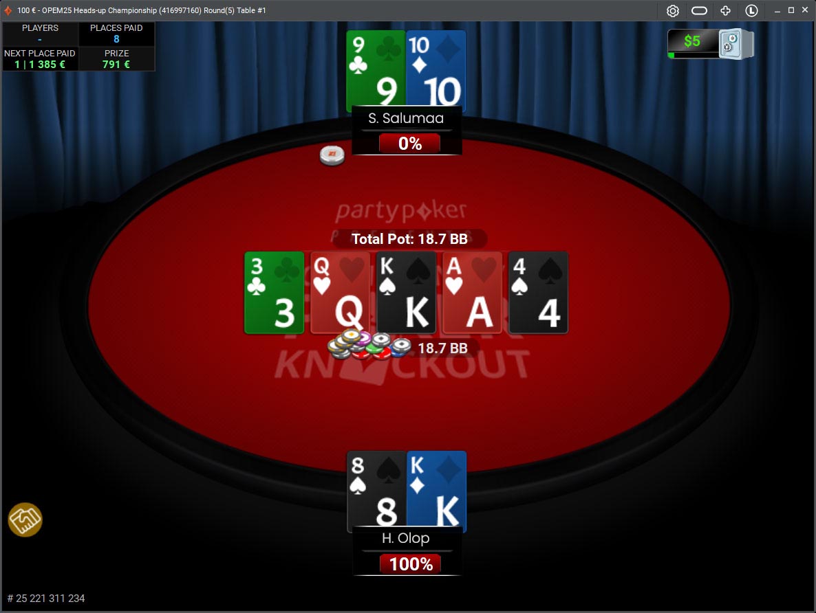 Otsustav käsi toimus kell 01.06, kui mindi neljandat korda all-ini. Vastamisi olid Olopi kuningas-viis ja Salumaa kümme-äss.